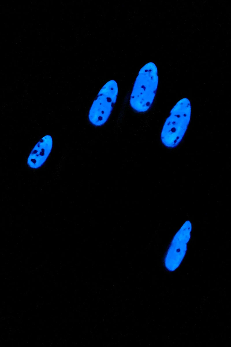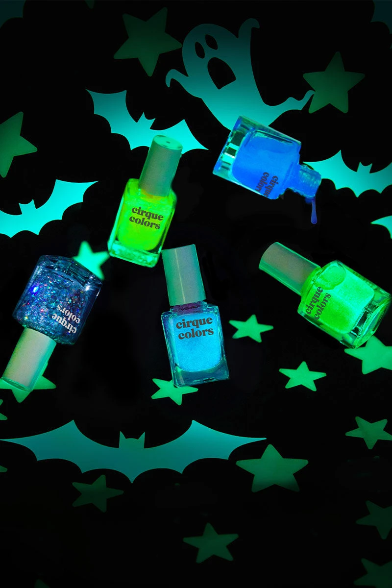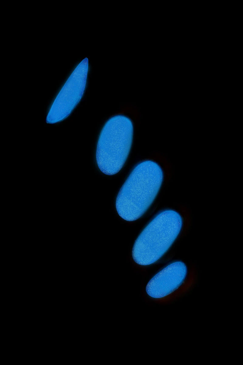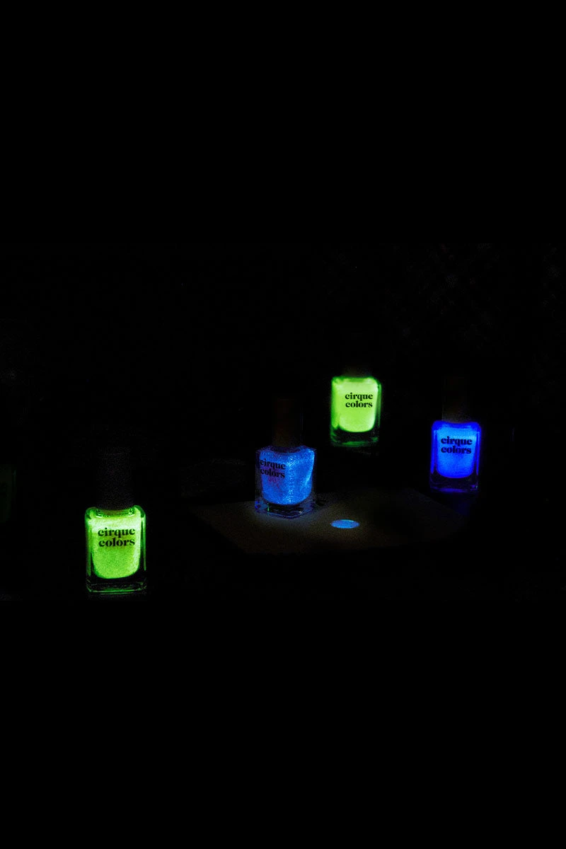 Please note: To achieve an optimal glow-in-the-dark effect, this polish needs to be ‘charged’ with an external light source (such as sunlight or artificial light) for a few hours before it can properly glow. For best results, apply 2 coats over a light base color, and due to the slight, grainy texture of the glow-in-the-dark pigment, we recommend adding 2 coats of our Looking Glass Top Coat for a smooth finish!