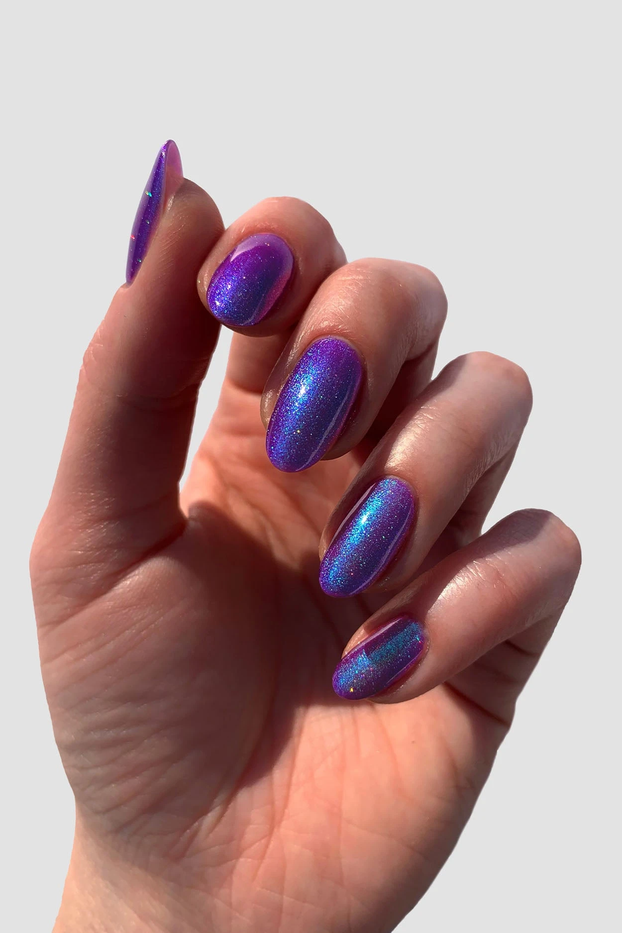 Night Fever is a deep violet nail polish with dazzling teal-blue-purple color-shifting shimmer and delicate holographic sparkle.