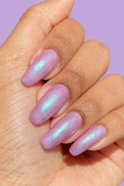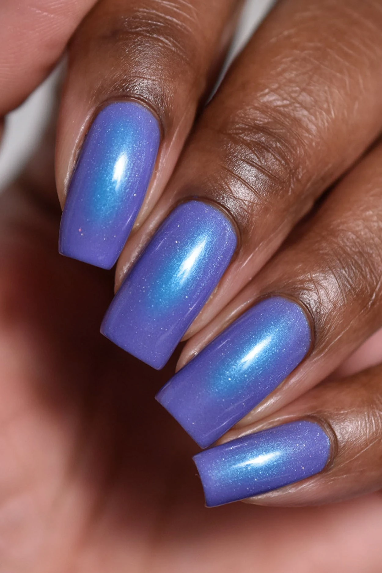 Nocturne is a deep periwinkle blue nail polish with teal shimmer and delicate holographic sparkle. Our shimmer polishes are packed with glimmering pigments which give them a unique multidimensional finish, unlike any other.