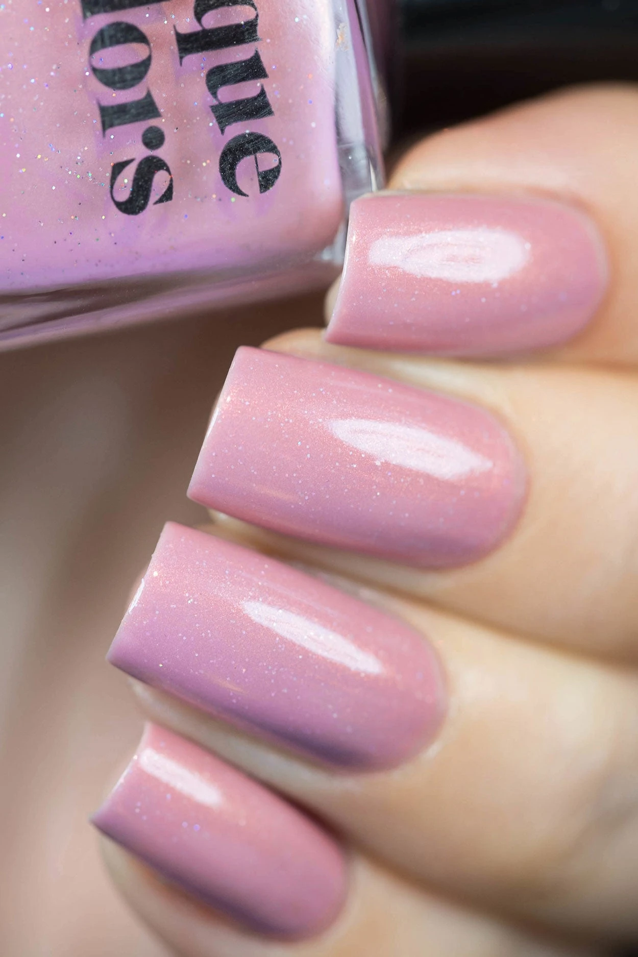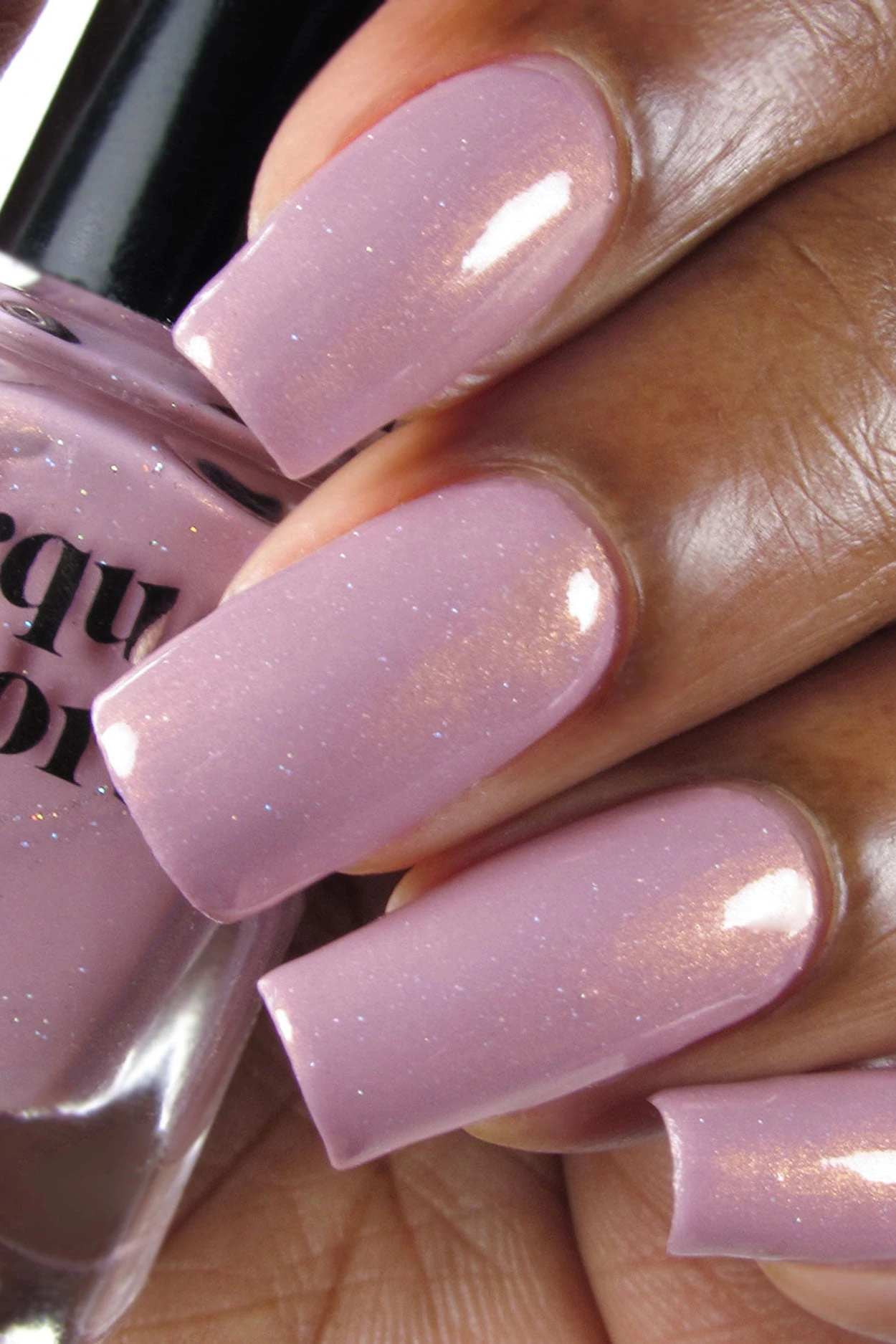 Plush Suede is a pink-lilac nail polish with strong copper shimmer and delicate holographic sparkle. Our shimmer polishes are packed with glimmering pigments which give them a unique multidimensional finish, unlike any other.