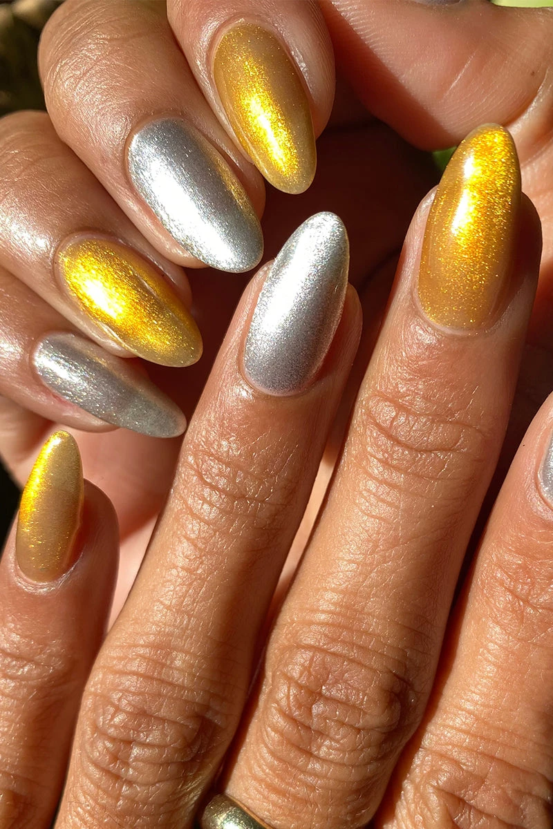Dip into the richness of our Precious Metal Duo featuring Alchemy, a bewitching gold magnetic nail polish, and Chemistry, a dazzling silver magnetic counterpart. Alchemy is a gray nail polish with gold magnetic pigment. Chemistry is a gray nail polish with silver magnetic pigment. These two enchanting hues, reminiscent of molten gold and liquid silver, will adorn your nails with the essence of opulence. Magnetic wand sold separately.
