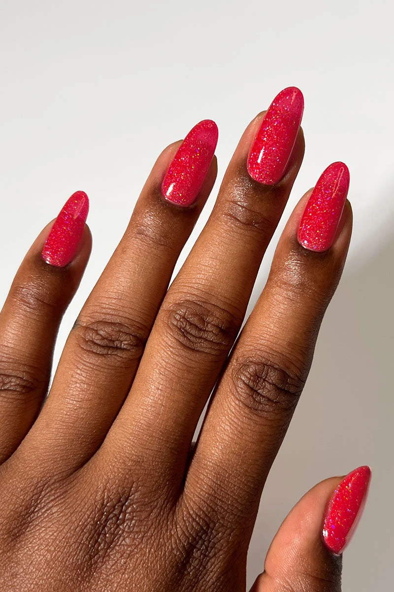 Red Bttms is a red holographic nail polish with a scattered holographic effect.