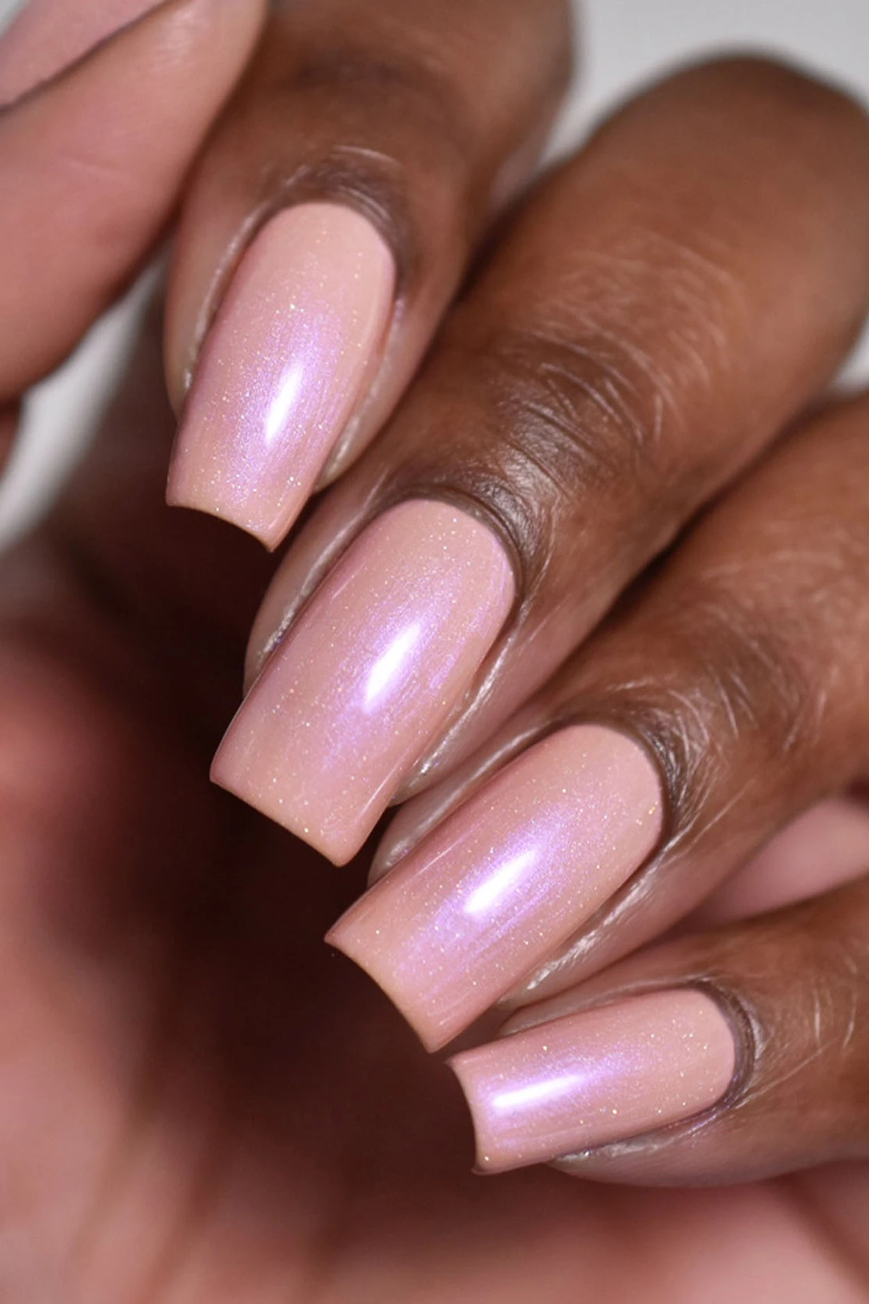 Reverie is a mauve pink-nude nail polish with soft purple shimmer and delicate holographic sparkle. Our shimmer polishes are packed with glimmering pigments which give them a unique multidimensional finish, unlike any other.