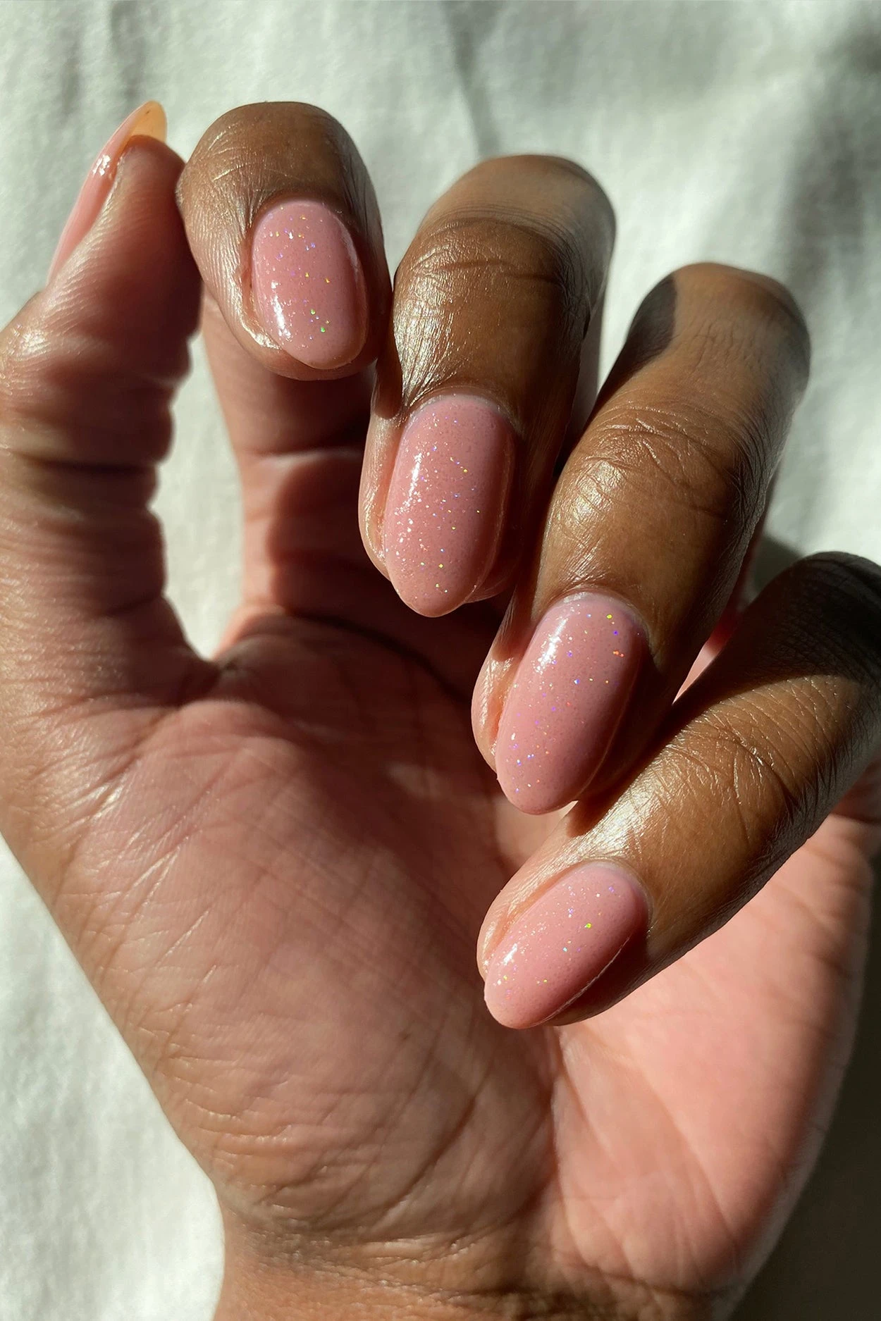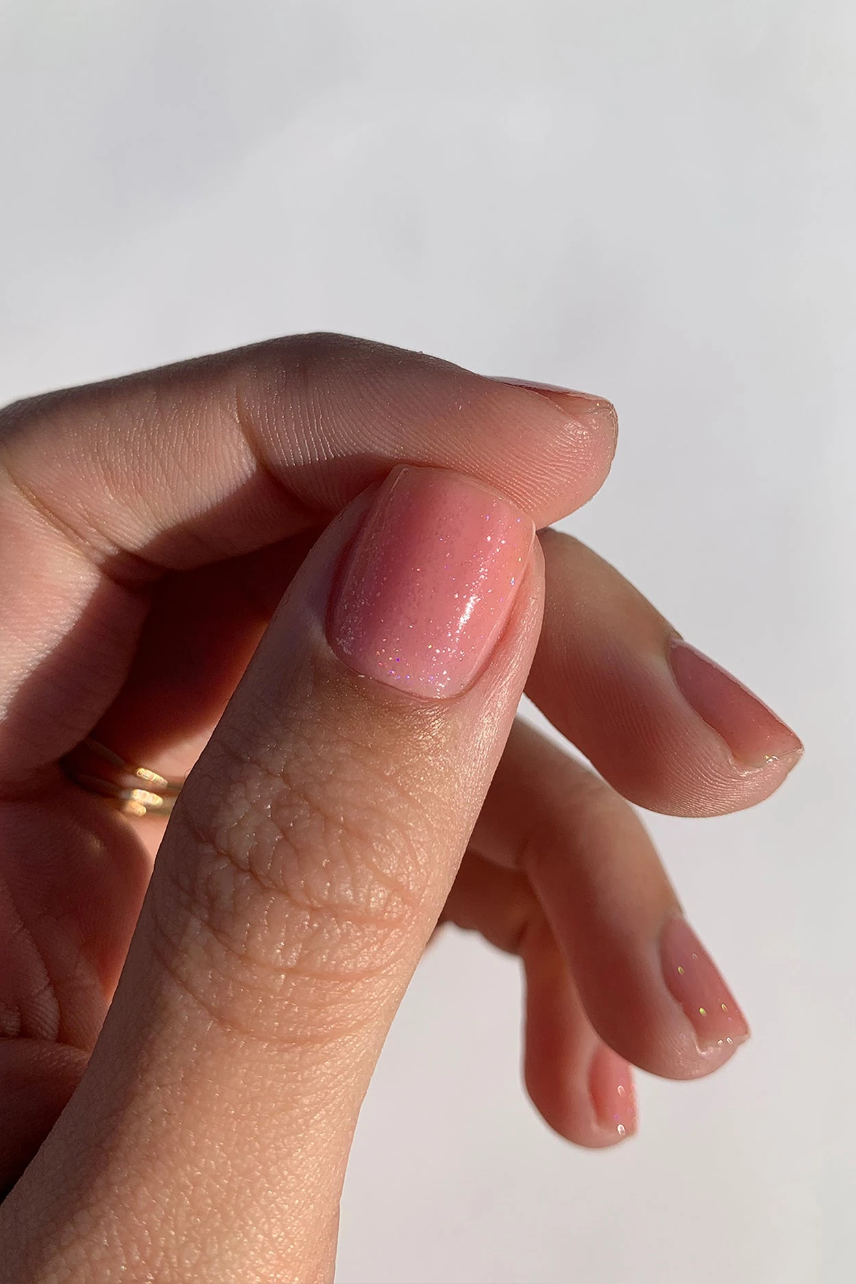 Rosé All Day is a glistening holographic glitter nail polish topper in a clear pink base. This polish is made with transparent holo glitters that won’t gray or wash out the color underneath. Layer this over a base color or wear it alone for a twinkling nude look.