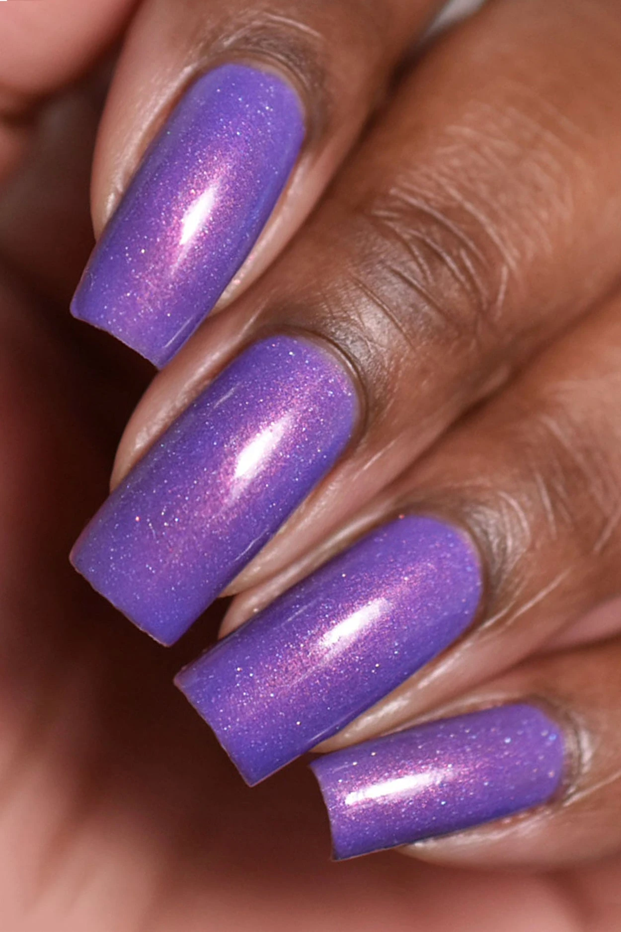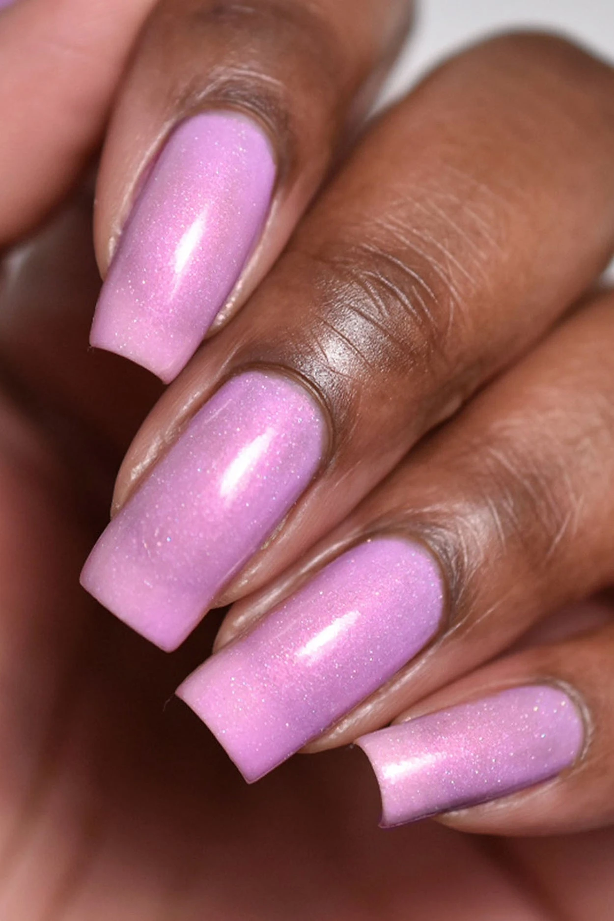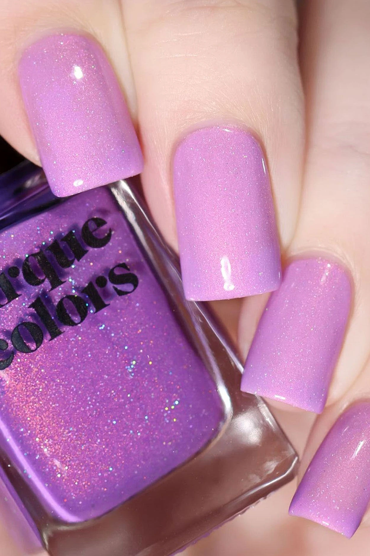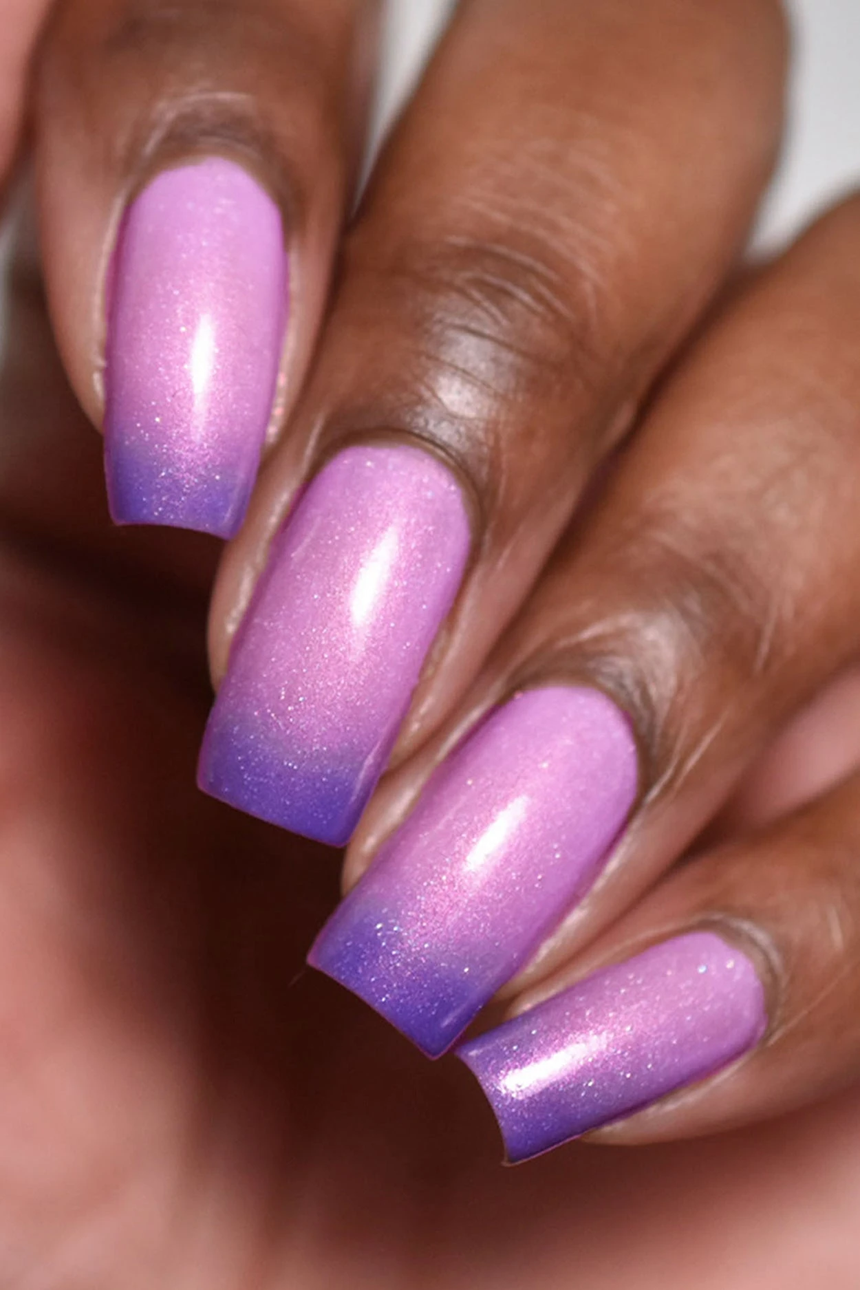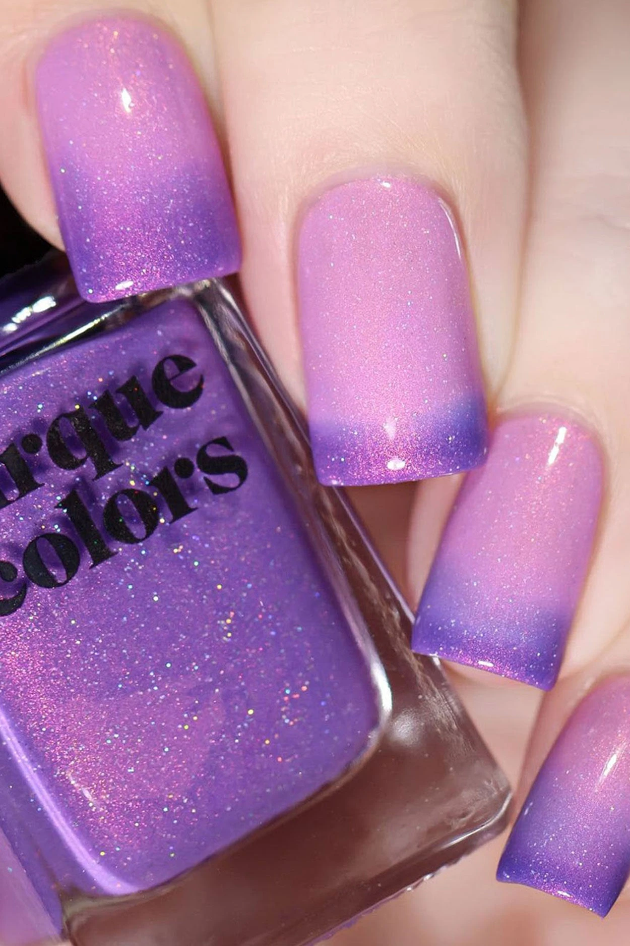 Sol is a thermal nail polish that changes colors based on temperature. This polish changes to purple when cold and baby pink when warm. It features vibrant pink shimmer and delicate holographic sparkle.
