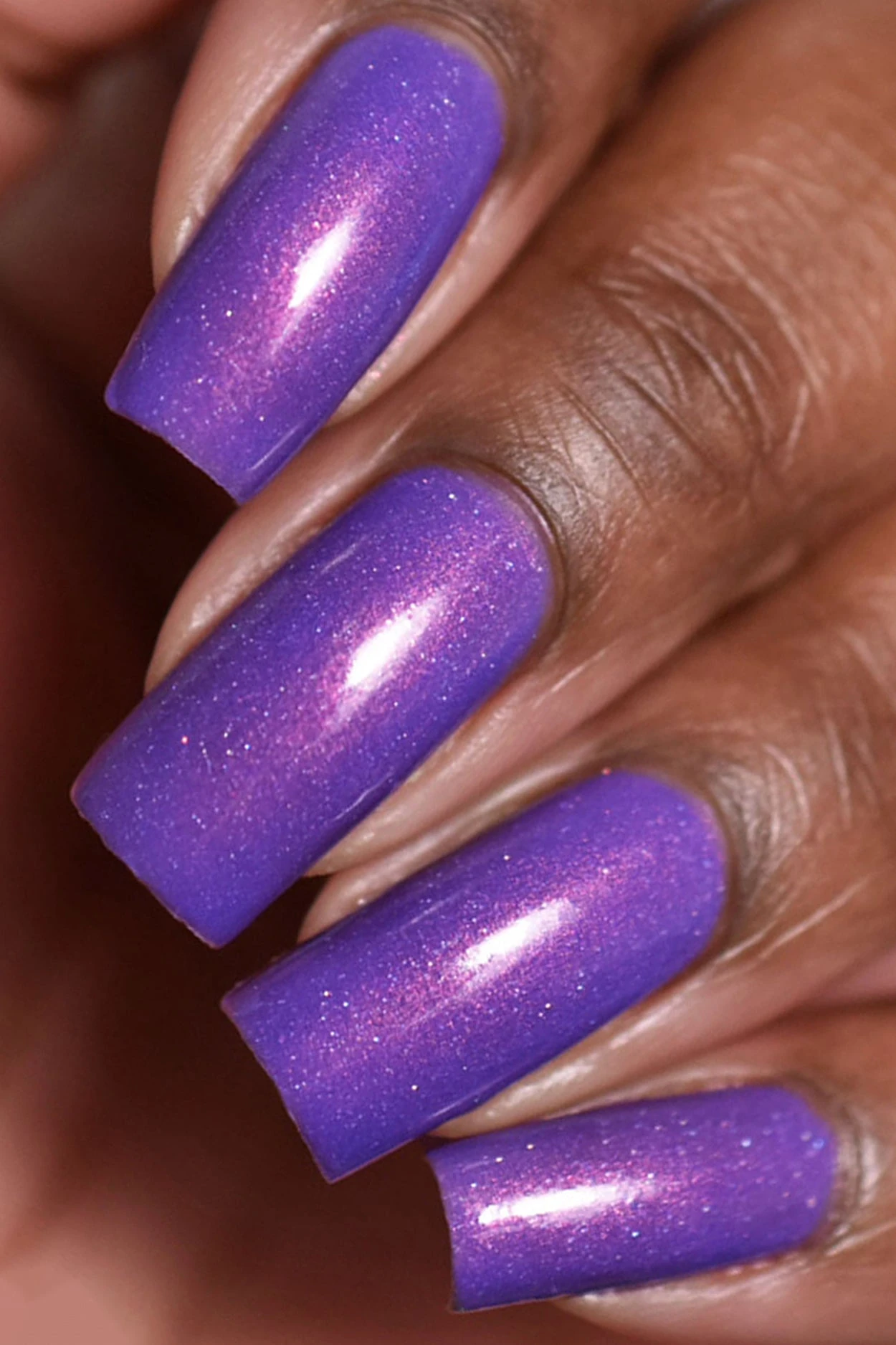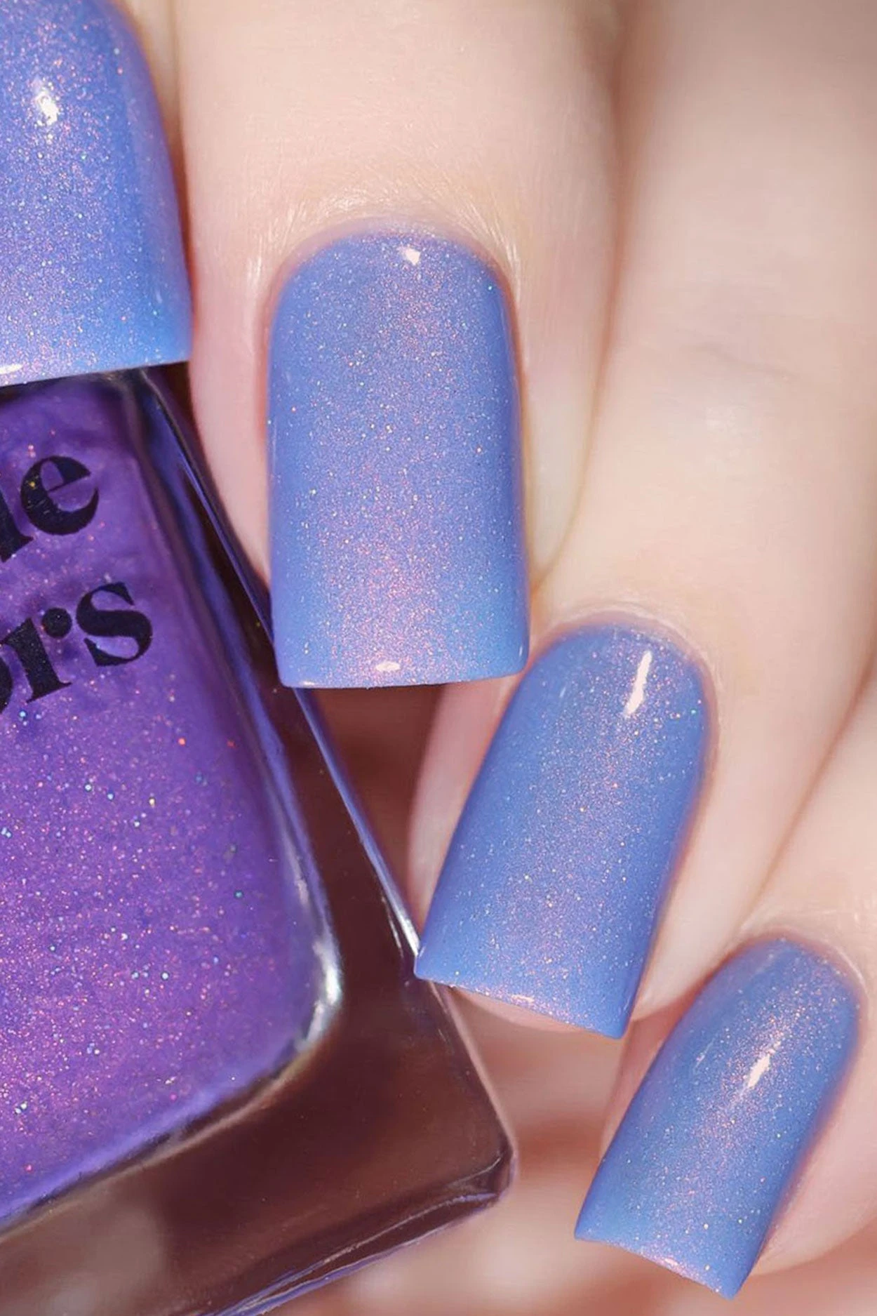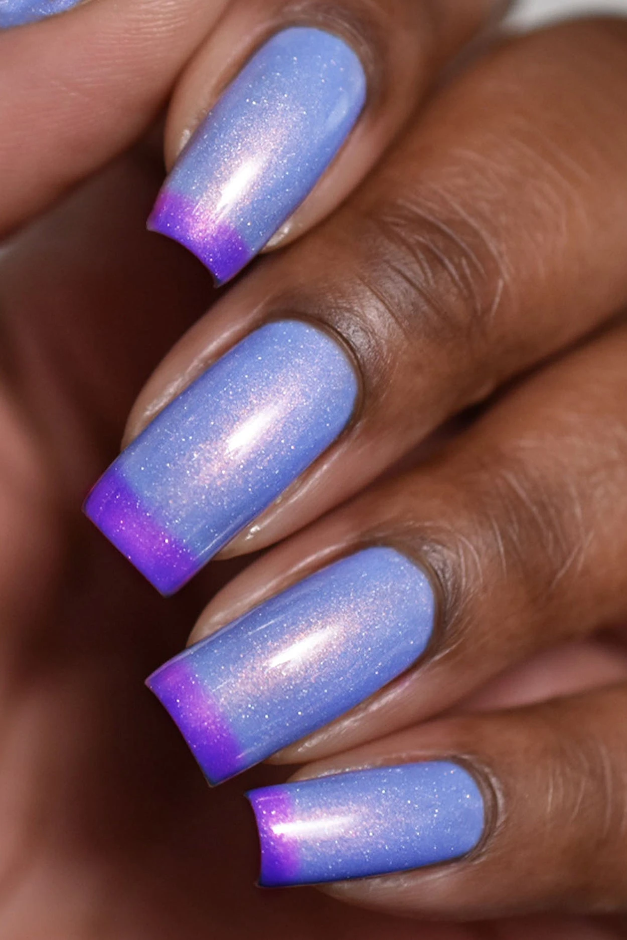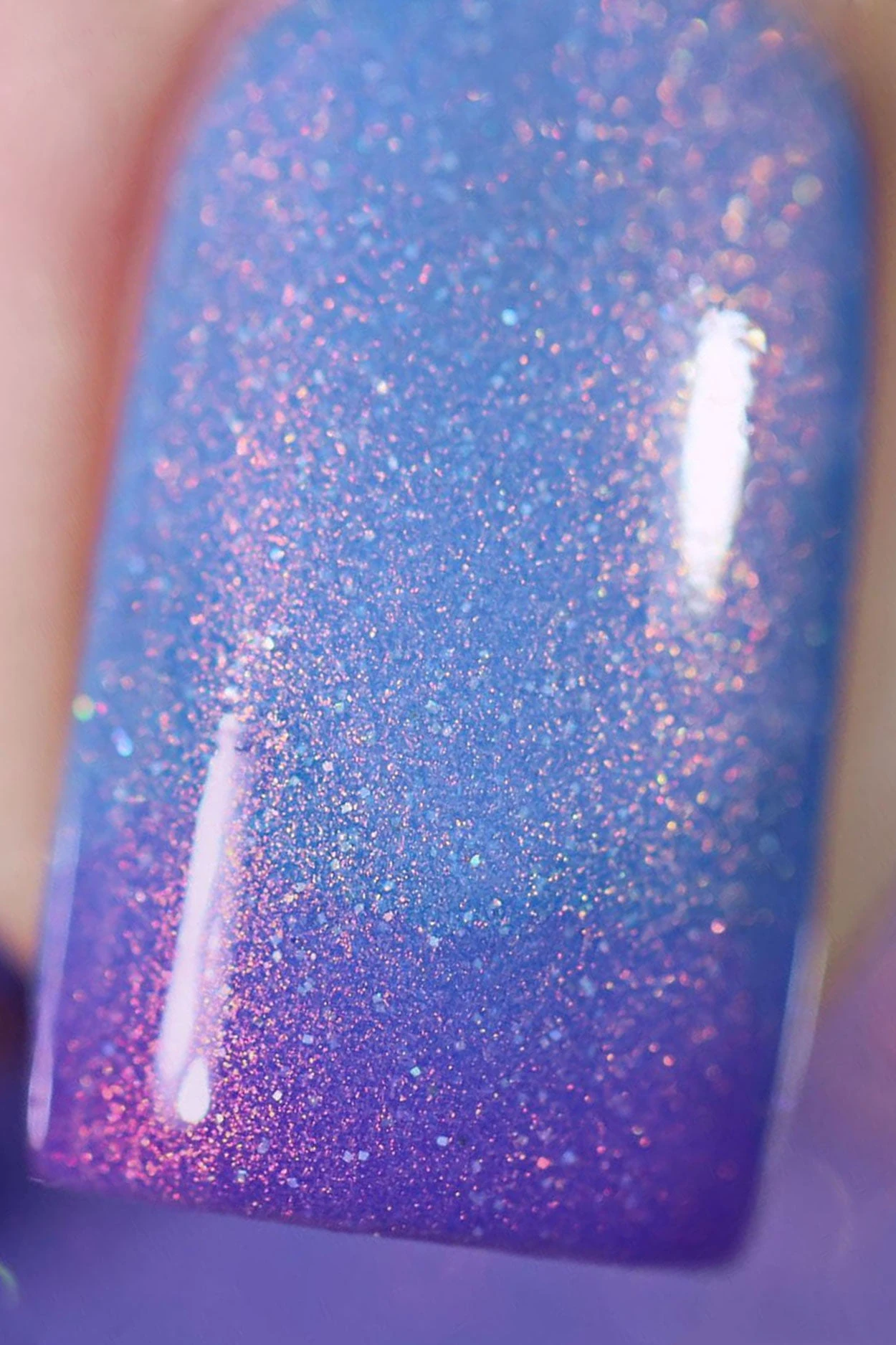 Terra is a thermal nail polish that changes colors based on temperature. This polish changes to purple when cold and light blue when warm. If features strong copper shimmer and delicate holographic sparkle.