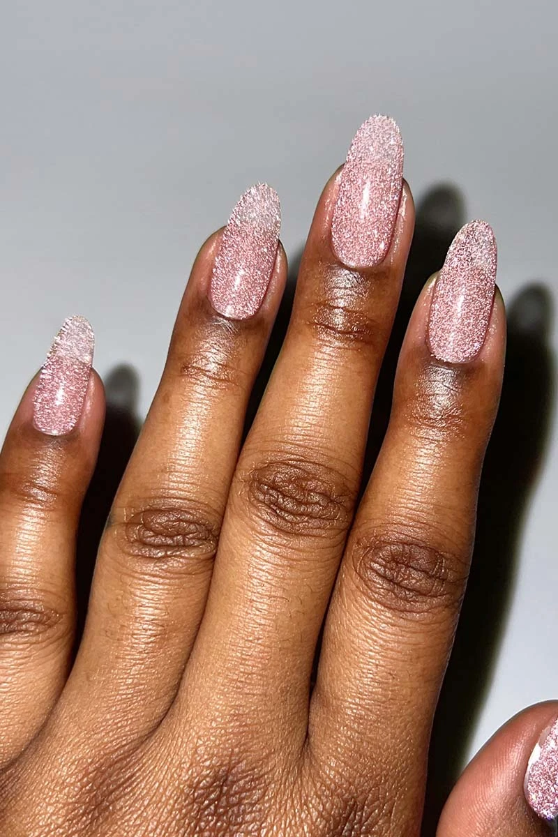 Tiny Dancer is a light pink flash reflective glitter nail polish topper. It contains special glitter particles that bounce back direct light (such as sunlight or strong indoor bulbs) for an intense sparkle effect.